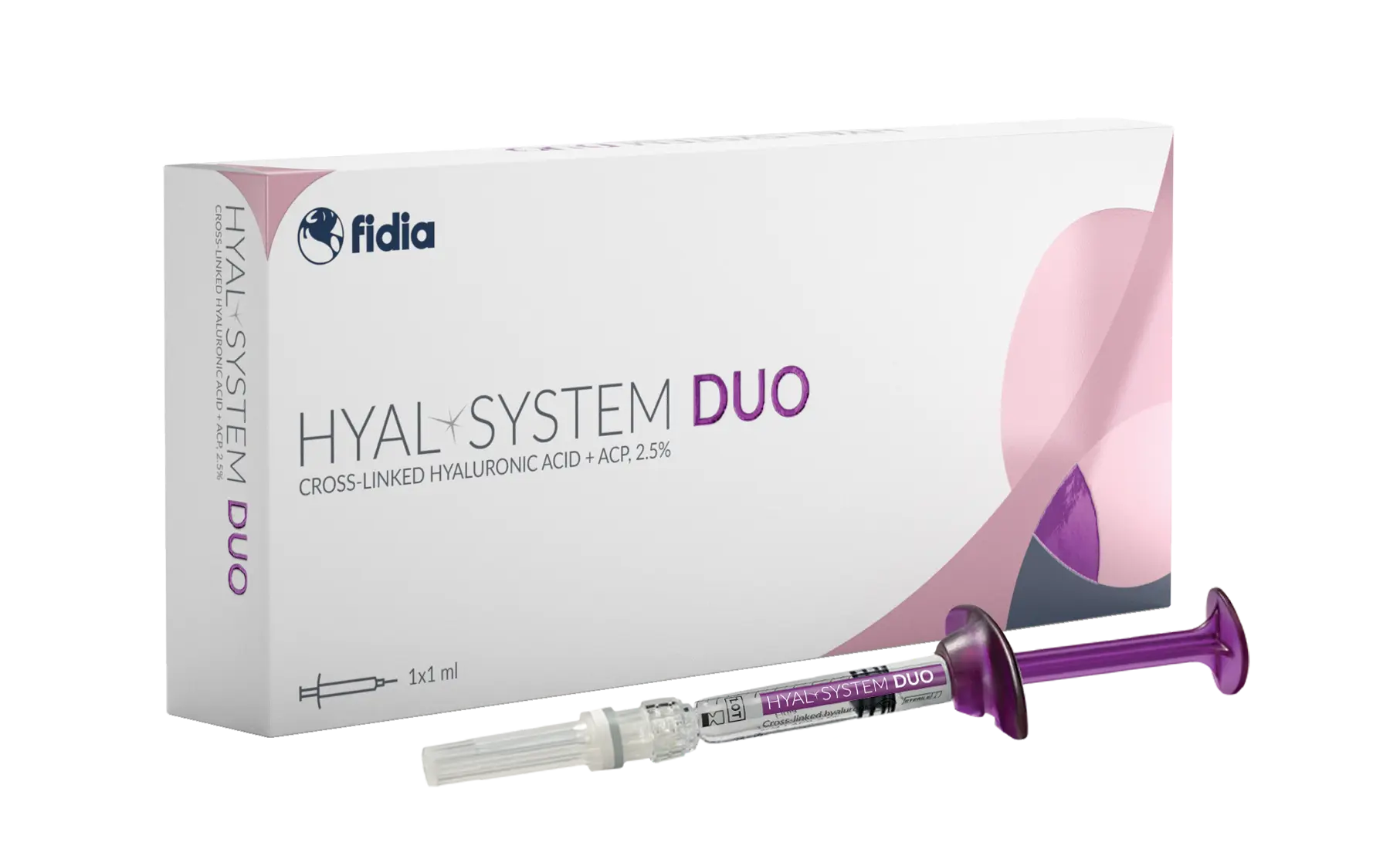 HYAL SYSTEM DUO (Хиал Систем Дуо)— биостимулирующий филлер. Уникальность этого препарата заключается в его двойственном действии. Он сочетает в себе два типа гиалуроновой кислоты : 75% стабилизированной ГК (сшитой BDDE) с концентрацией 25 мг/мл, которая создает каркас, мгновенно восполняет объем и заполняет средние и глубокие морщины + 25% низкомолекулярной ГК (200 кДа), стабилизированной по технологии ACP (Auto-Crosslinked Polymer). Эта фракция, постепенно высвобождаясь, запускает мощные биостимулирующие процессы, активируя фибробласты и усиливая выработку собственного коллагена и эластина. Ключевые назначения HYAL-SYSTEM DUO: деликатное наполнение, продленная биостимуляция, реконструкция и укрепление дермальных структур кожи