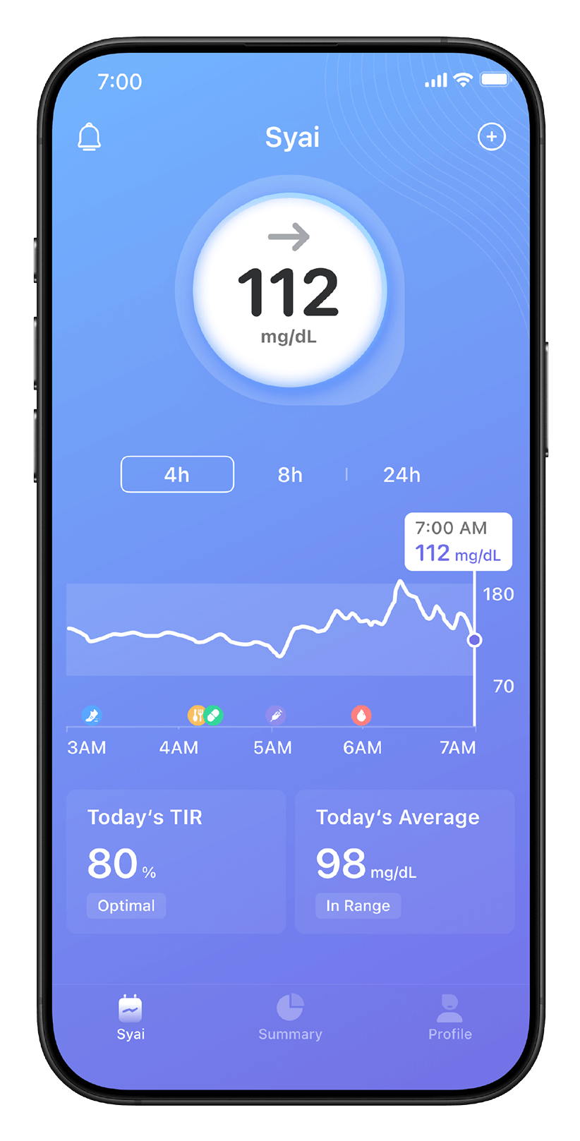 Syai Х1— интеллектуальная система непрерывного мониторинга глюкозы (НМГ), которая измеряет сахар в реальном времени и отправляет данные прямо на ваш телефон. Без боли, без стресса, 24/7.