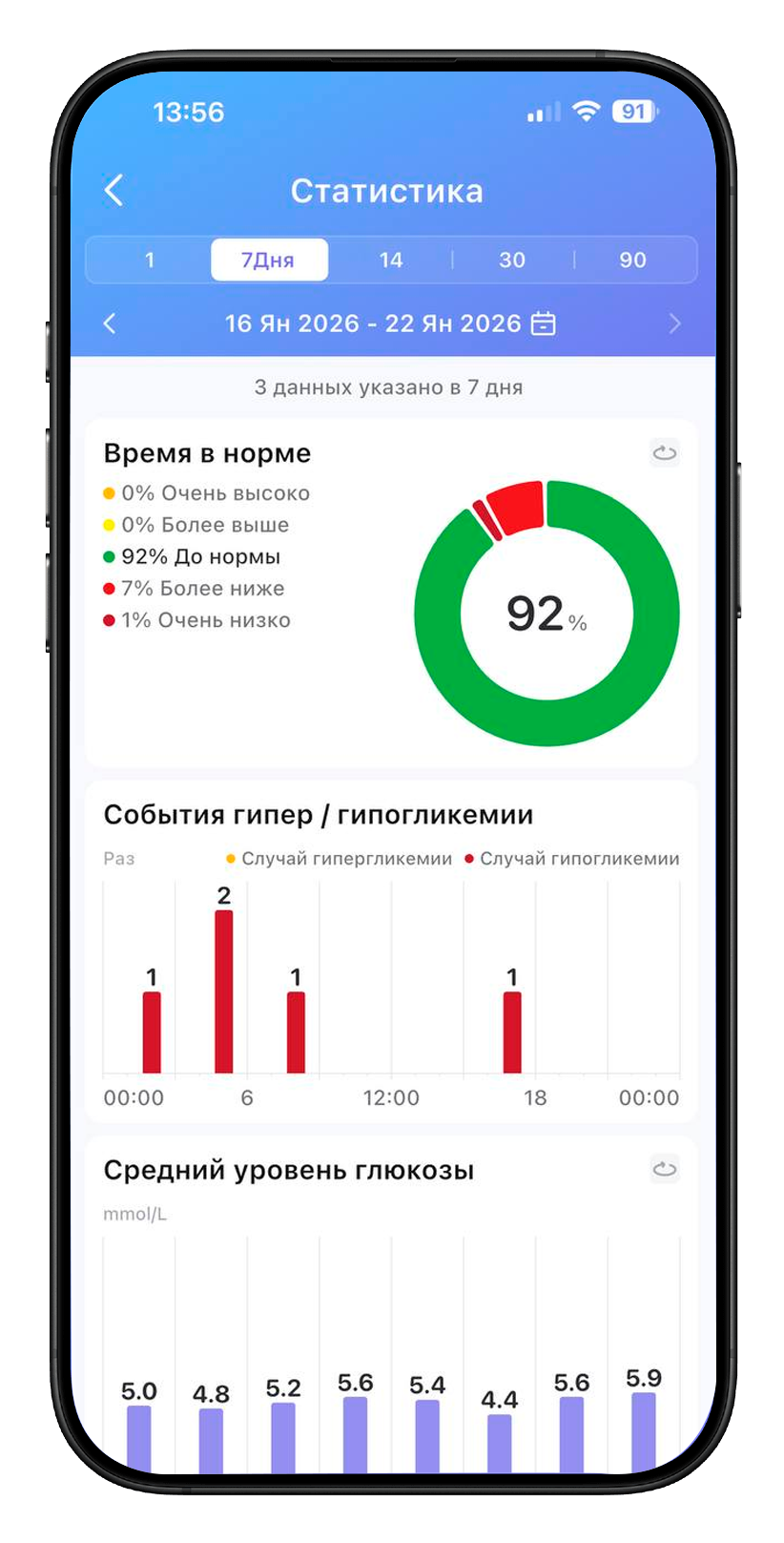 | Интервал замеров | Автоматическая регистрация уровня глюкозы каждые 5 минут (288 измерений в сутки). |